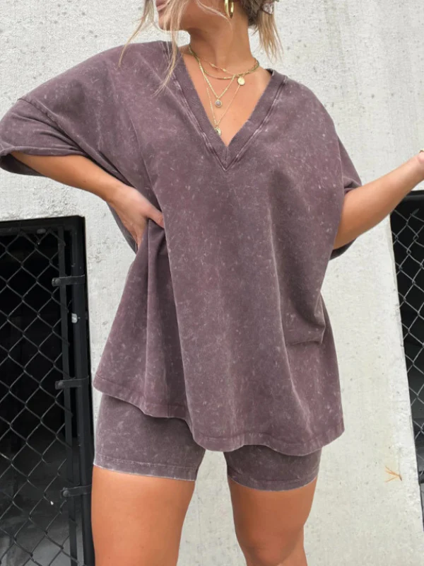 Dieses trendige, gewaschene Sommer-Set wurde entworfen, um sich nahtlos deinem hektischen Lebensstil anzupassen. Dank des schicken und entspannten Looks ist es perfekt für alles – vom entspannten Brunch bis zum Abend mit Freunden. Die einfarbige Optik und das gewaschene Design verleihen Eleganz, während die lockere Passform des T-Shirts und der schlanke Schnitt der Shorts dafür sorgen, dass du immer stilvoll gekleidet bist.
